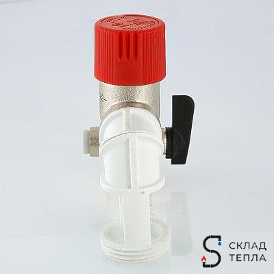Поворотный сливной пластиковый патрубок с устройством разрыв струи может быть соединен с канализацией с помощью гофрошланга с накидной гайкой 1 ¼”. Предохранительный клапан группы безопасности имеет устройство принудительного открытия, что позволяет открывать клапан для слива воды из бойлера, проверки срабатывания и предотвращения залипания золотника.