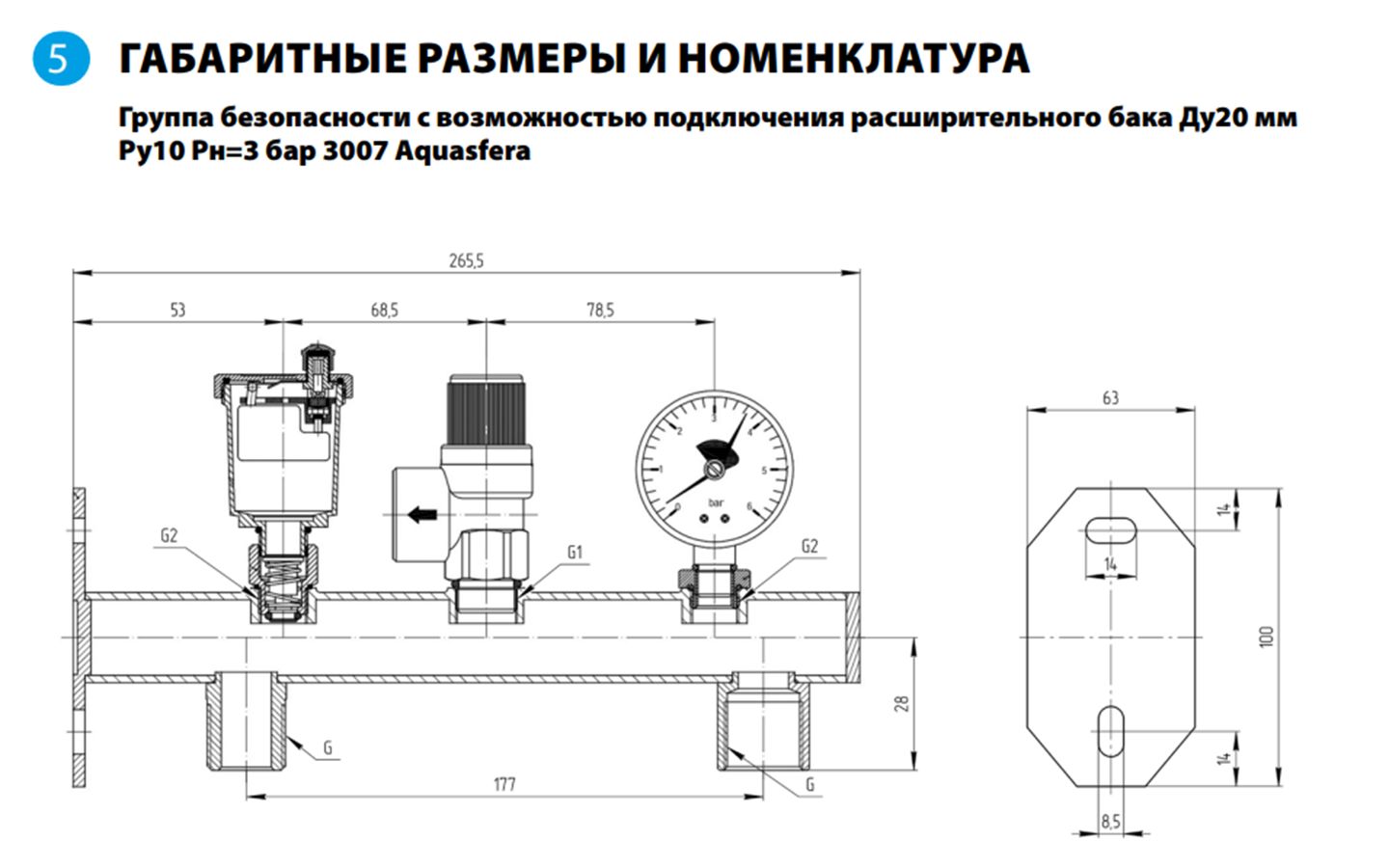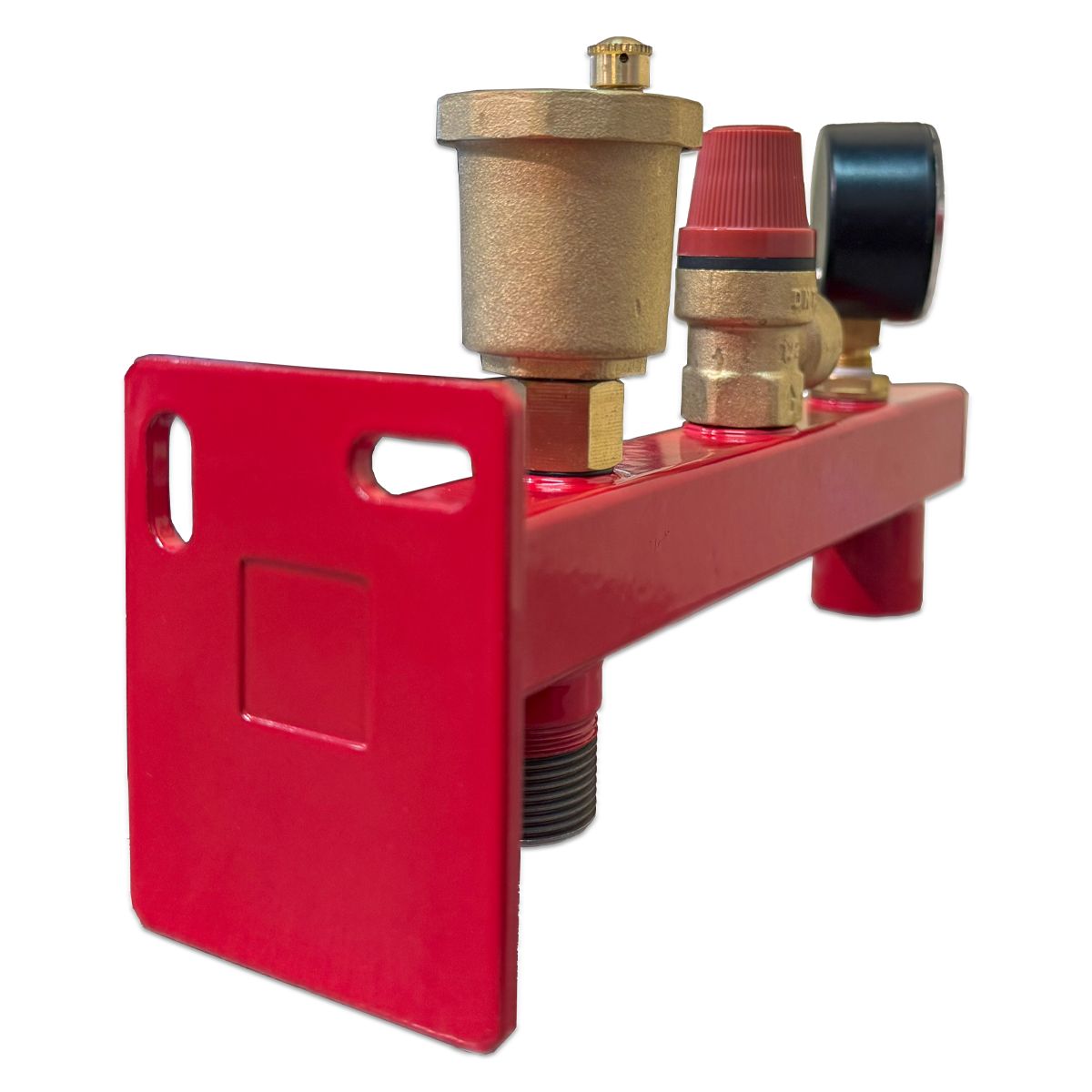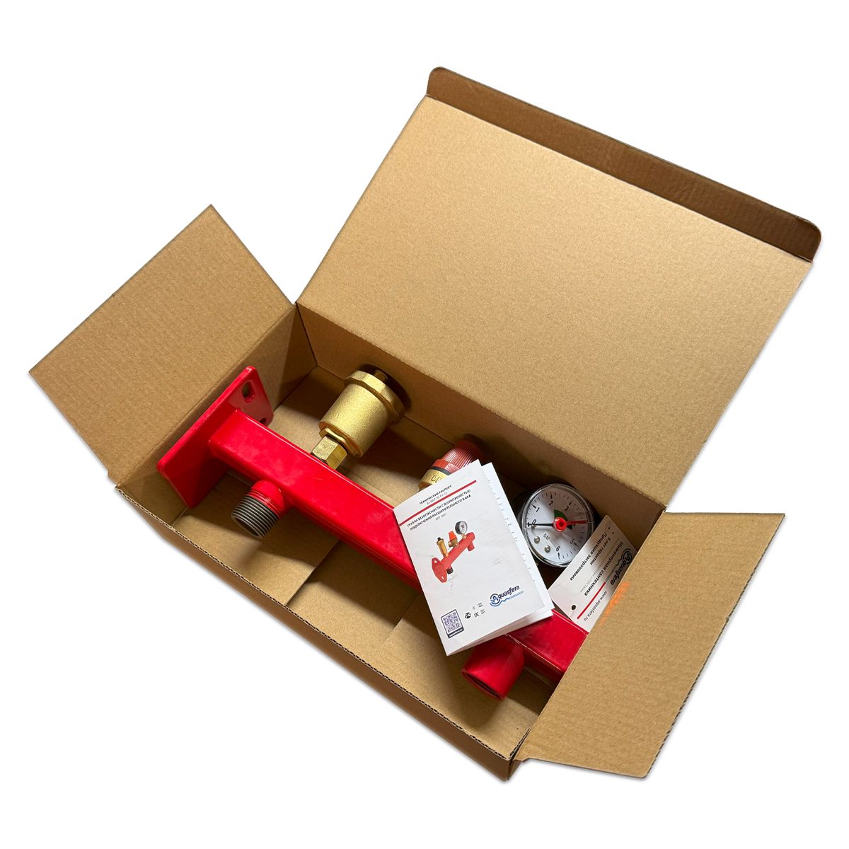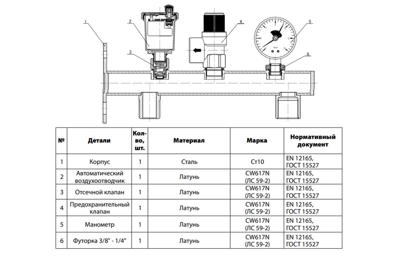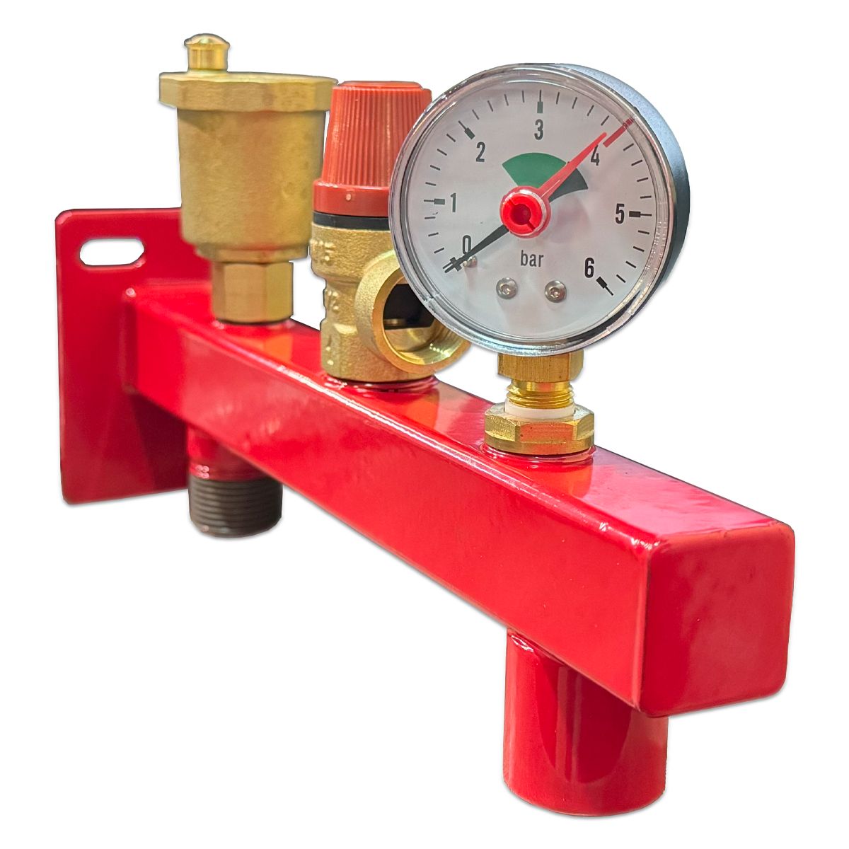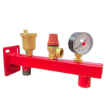 Группа безопасности комплектуется автоматическим поплавковым воздухоотводчиком, предохранительным клапаном и манометроу, а также двумя резьбовой выходами для присоединения котла и расширительного бака.