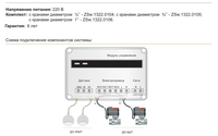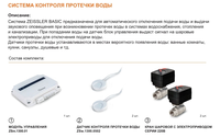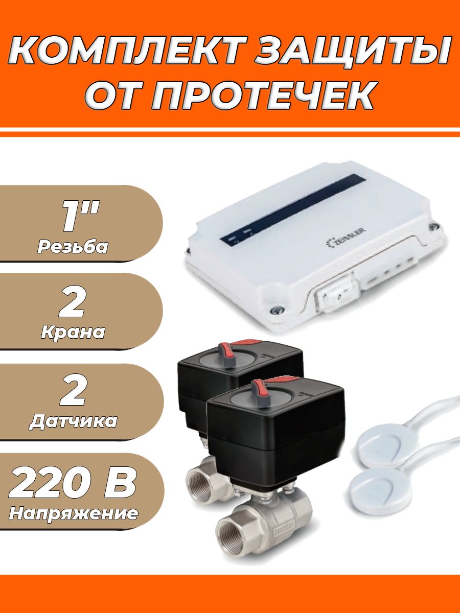Комплект включает в себя: Модуль управления - 1 шт; Кран шаровый с электроприводом - 2шт; Датчик контроля протечки - 2шт.