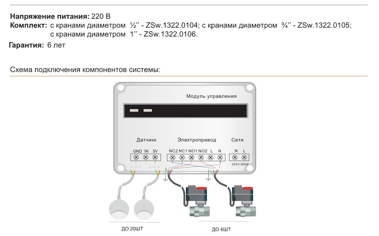 Модуль поддерживает подключение до 20 датчиков протечки и до 6 кранов.