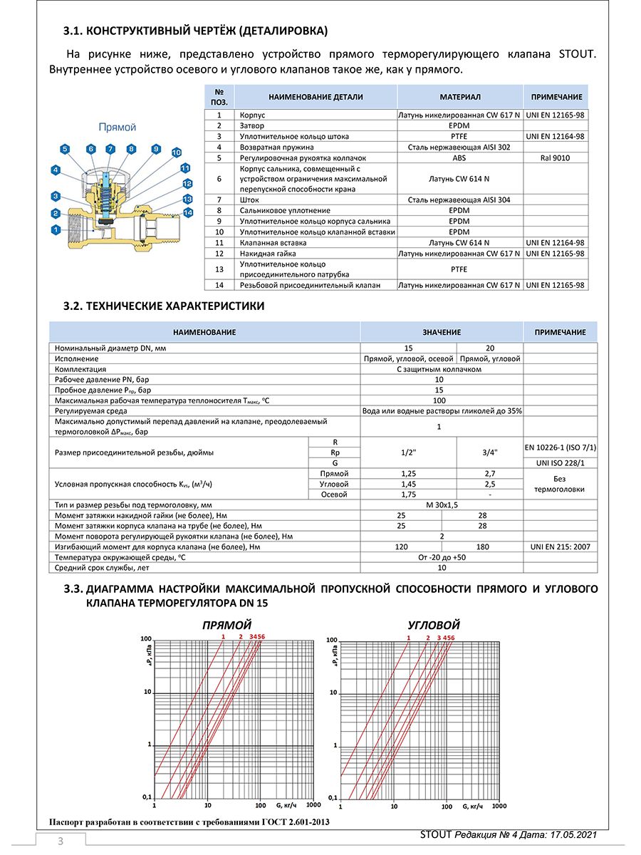 Клапаны Stout серии SVT - нормально открытые, закрываются под воздействием термоголовки. Для гидравлической балансировки системы отопления клапаны имеют устройство предварительной настройки максимальной пропускной способности за счет ограничения подъема их штока. Терморегулирующие клапаны поставляются в комплекте с защитным колпачком, который может служить для временного ручного регулирования и отключения радиатора в процессе монтажа и наладки системы отопления. Размер присоединения термостатического элемента - M30x1.5.
