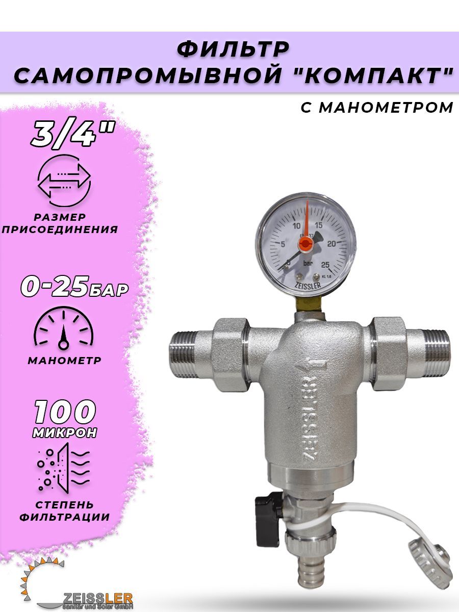 Фильтр промывной компактный с манометром Zeissler - 3/4" ZSF.302.0105N