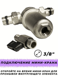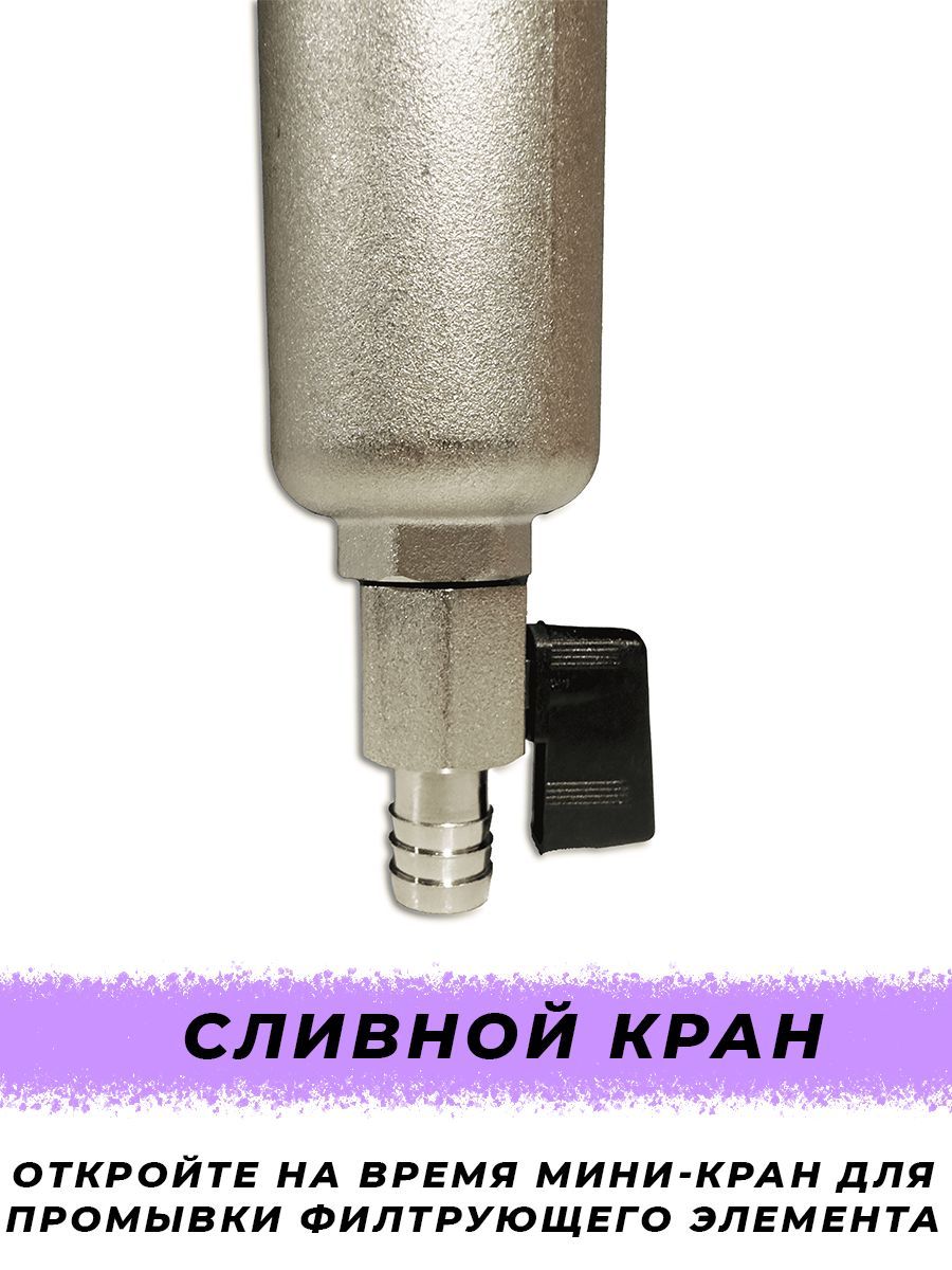 Принцип работы фильтров такого типа очень прост: вода под давлением поступает в корпус фильтра через входное отверстие, в которой уже установлен фирменный фильтрующий элемент механической очистки - съёмный фильтрующий картридж из нержавеющей стали с фильтрацией в 100 микрон. Далее вода просачивается сквозь фильтрующий элемент снаружи вовнутрь и выходит через второе отверстие, двигаясь дальше по разводке водопровода.