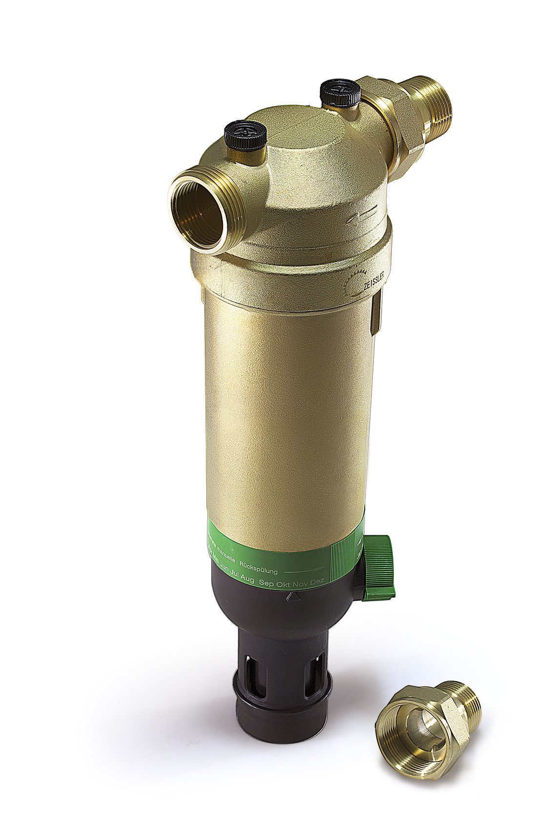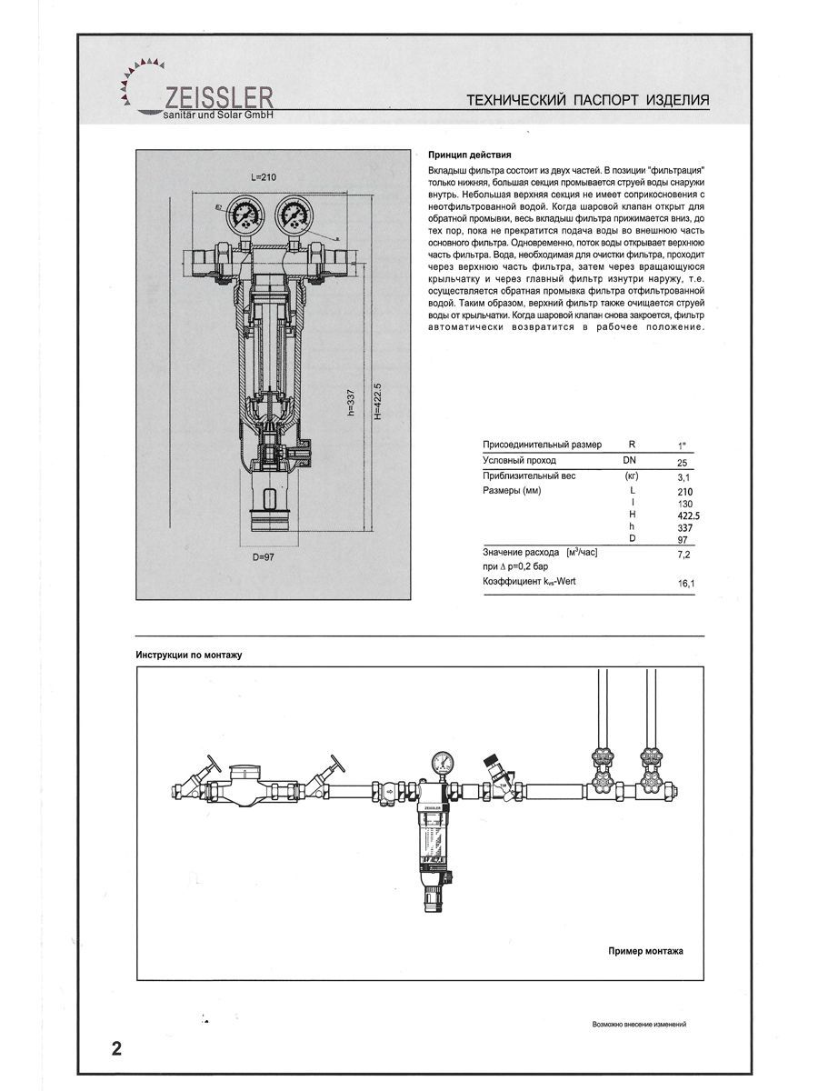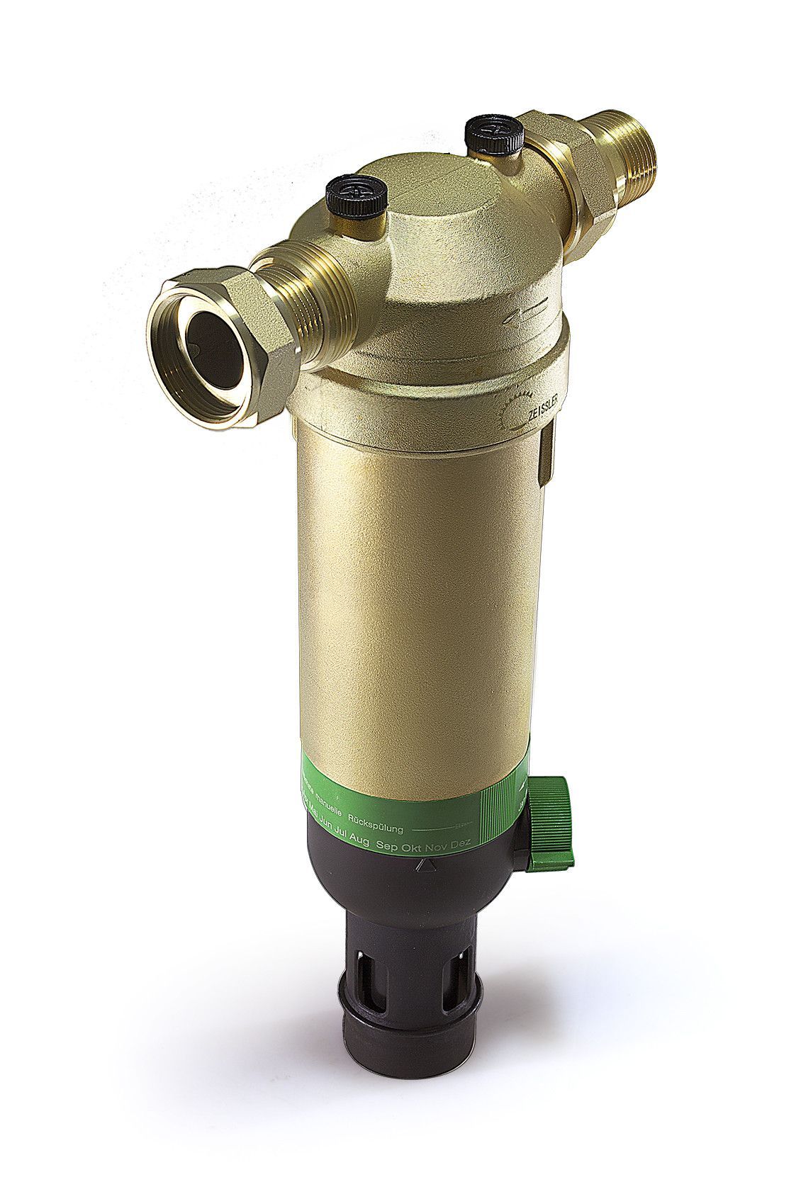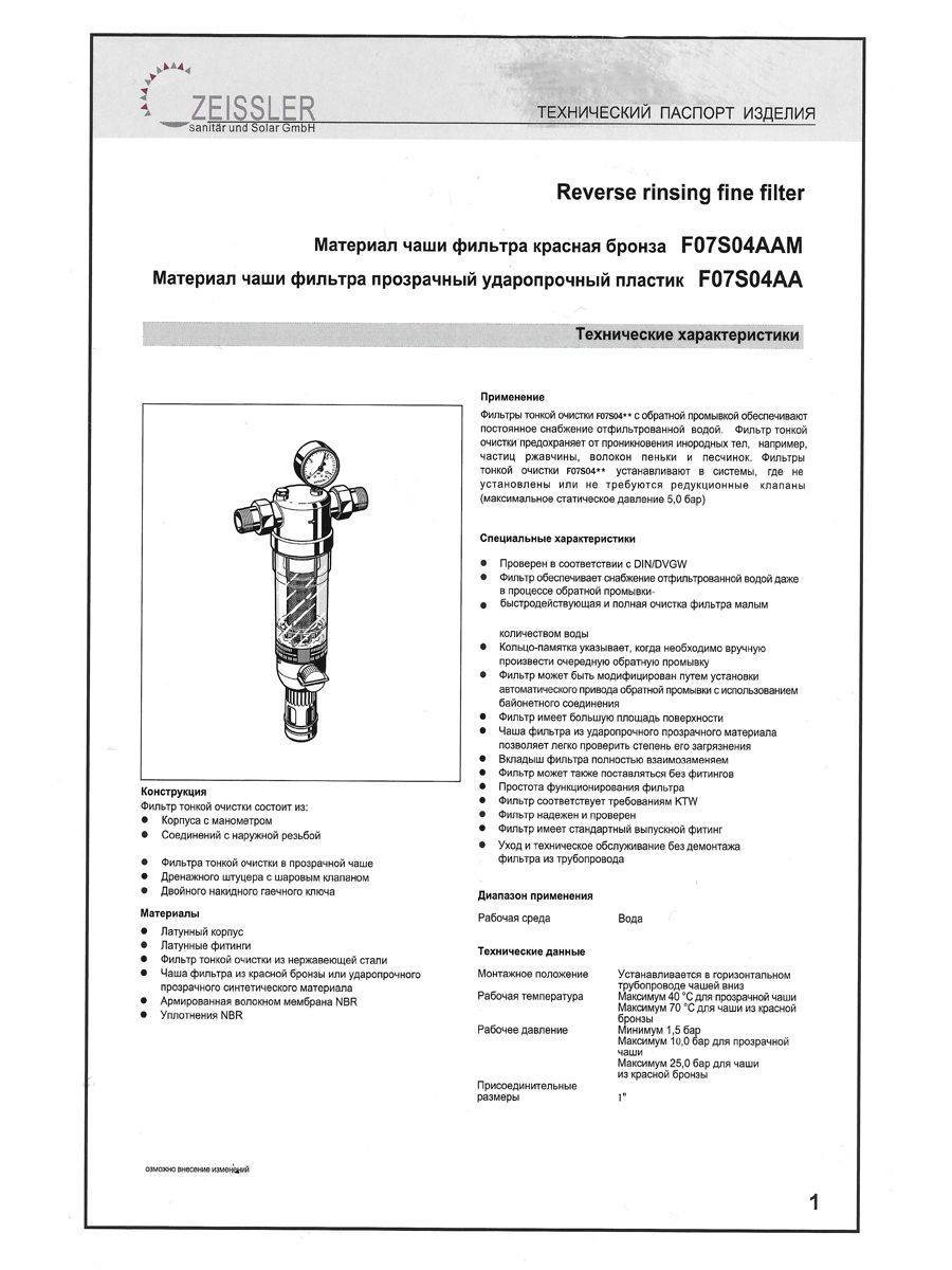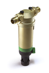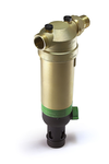 Фильтр тонкой очистки TIM F07S04AA/M. Кольцо-памятка указывает, когда необходимо вручную провести очередную промывку. Принцип действия: Сетчатый вкладыш фильтра состоит из основной нижней и дополнительной верхней секции. В режиме фильтрации малая верхняя секция закрыта, и вода проходит через основную секцию в направлении снаружи внутрь. При открывании шарового клапана включается режим обратной промывки, при этом весь сетчатый вкладыш опускается вниз. В таком положении прекращается поступление воды к основной секции фильтра, и она начинает проходить через малую верхнюю секцию, где после очистки поток разделяется на два направления: одно – к потребителям воды, второе – для проведения очистки. Этот второй поток раскручивает турбину и, пройдя сквозь нее с ускорением, промывает нижнюю секцию сетчатого фильтра в направлении изнутри наружу. Таким образом, основная секция фильтра под полным впускным давлением полностью очищается по всей площади поверхности.