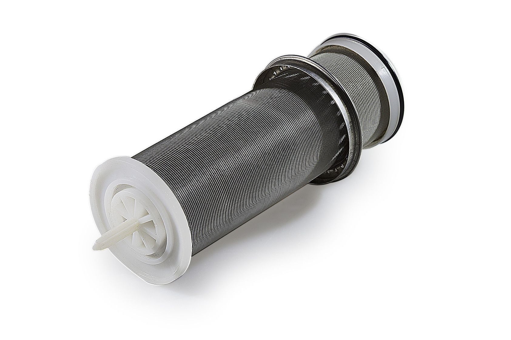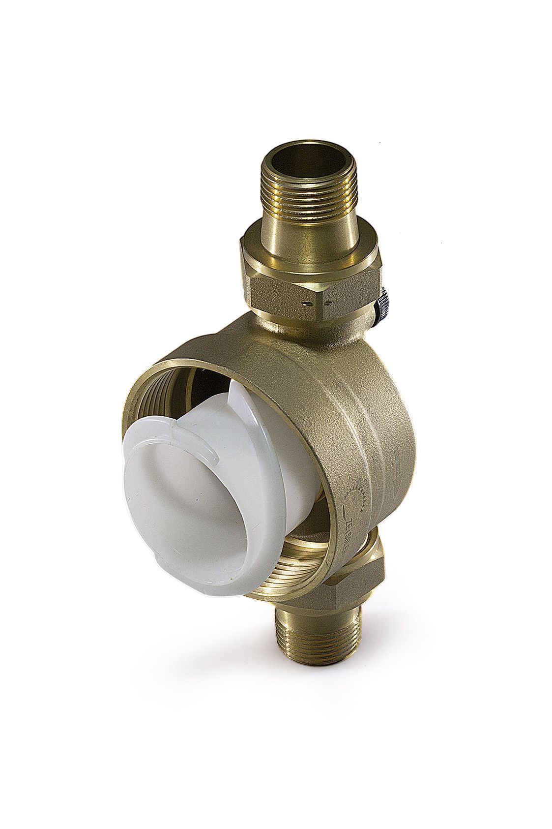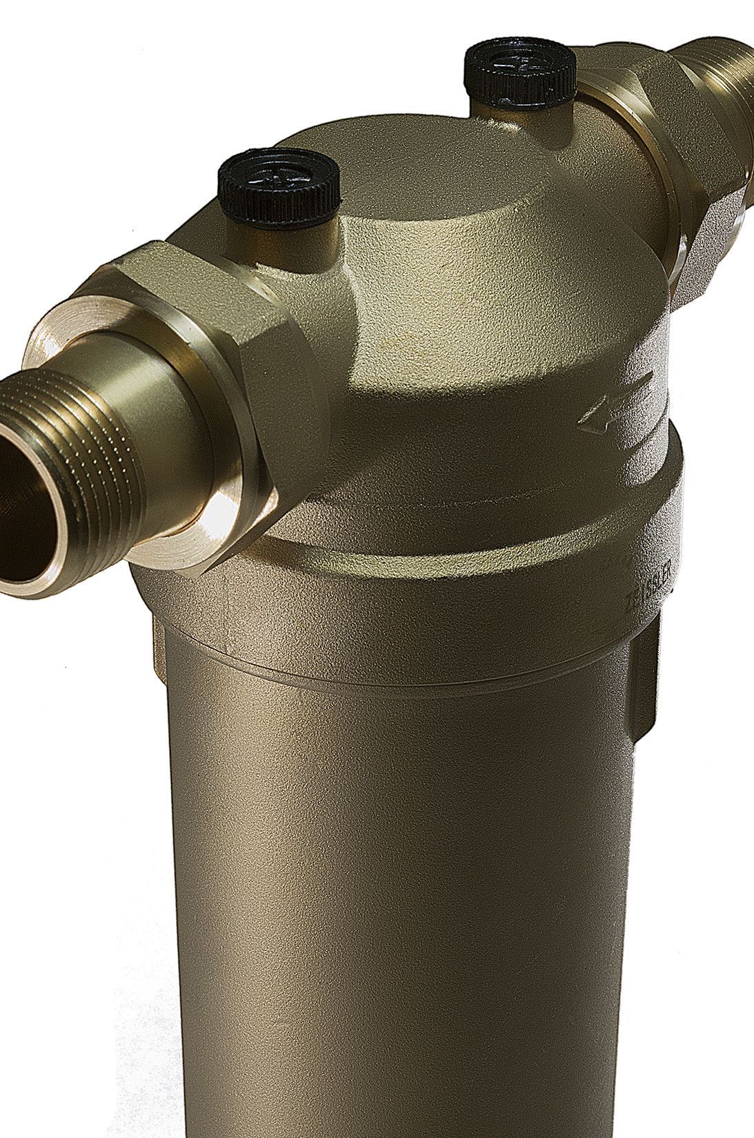 Фильтр тонкой очистки TIM F07S04AA/M. Кольцо-памятка указывает, когда необходимо вручную провести очередную промывку. Принцип действия: Сетчатый вкладыш фильтра состоит из основной нижней и дополнительной верхней секции. В режиме фильтрации малая верхняя секция закрыта, и вода проходит через основную секцию в направлении снаружи внутрь. При открывании шарового клапана включается режим обратной промывки, при этом весь сетчатый вкладыш опускается вниз. В таком положении прекращается поступление воды к основной секции фильтра, и она начинает проходить через малую верхнюю секцию, где после очистки поток разделяется на два направления: одно – к потребителям воды, второе – для проведения очистки. Этот второй поток раскручивает турбину и, пройдя сквозь нее с ускорением, промывает нижнюю секцию сетчатого фильтра в направлении изнутри наружу. Таким образом, основная секция фильтра под полным впускным давлением полностью очищается по всей площади поверхности.
