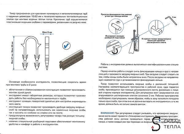 Такер – это инструмент, предназначенный для крепления полимерных и металлополимерных труб с наружным диаметром 16-20 мм к пенополистирольным теплоизоляционным плитам при монтаже водяных тёплых полов. Якорная скоба под воздействием такера врезается в изоляционный слой и надежно фиксирует трубу.