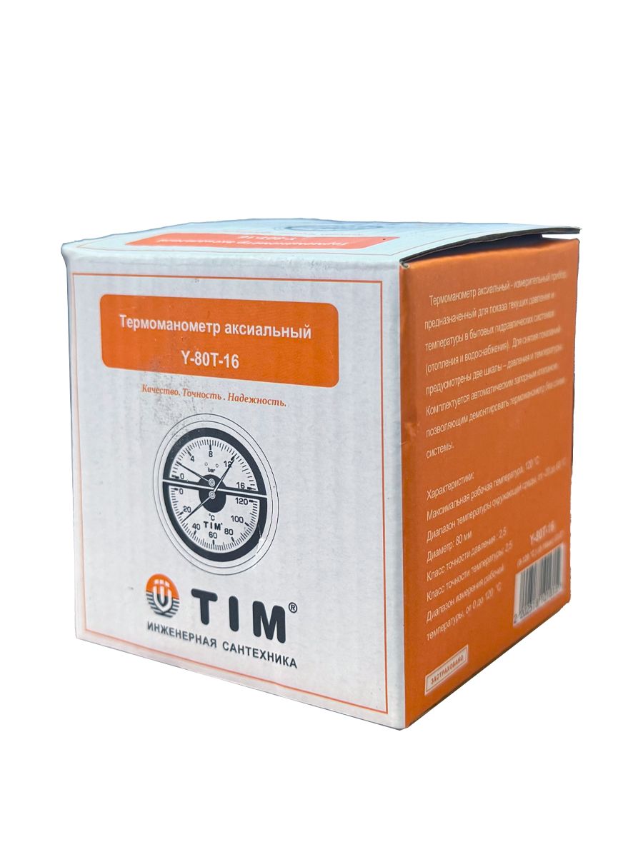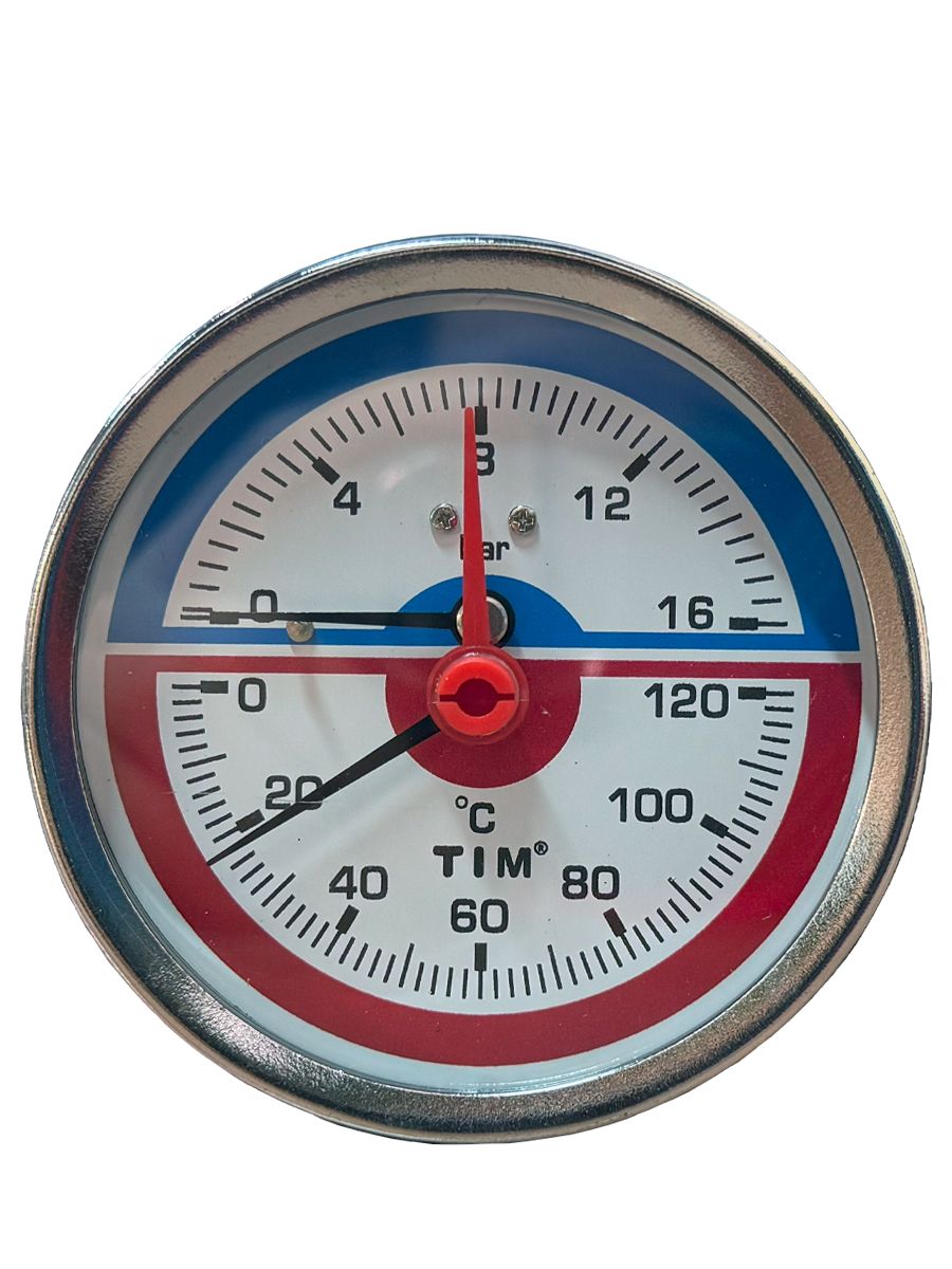 Термоманометр Y-80T-16 производства TIM с диаметром корпуса 80 мм и осевым подключением 1/2" НР рассчитан на одновременное измерение давления до 16 bar и температуры до 120оС. Прибор может использоваться в неагрессивных средах (не разрушающих медные сплавы) в системах отопления и водоснабжения.