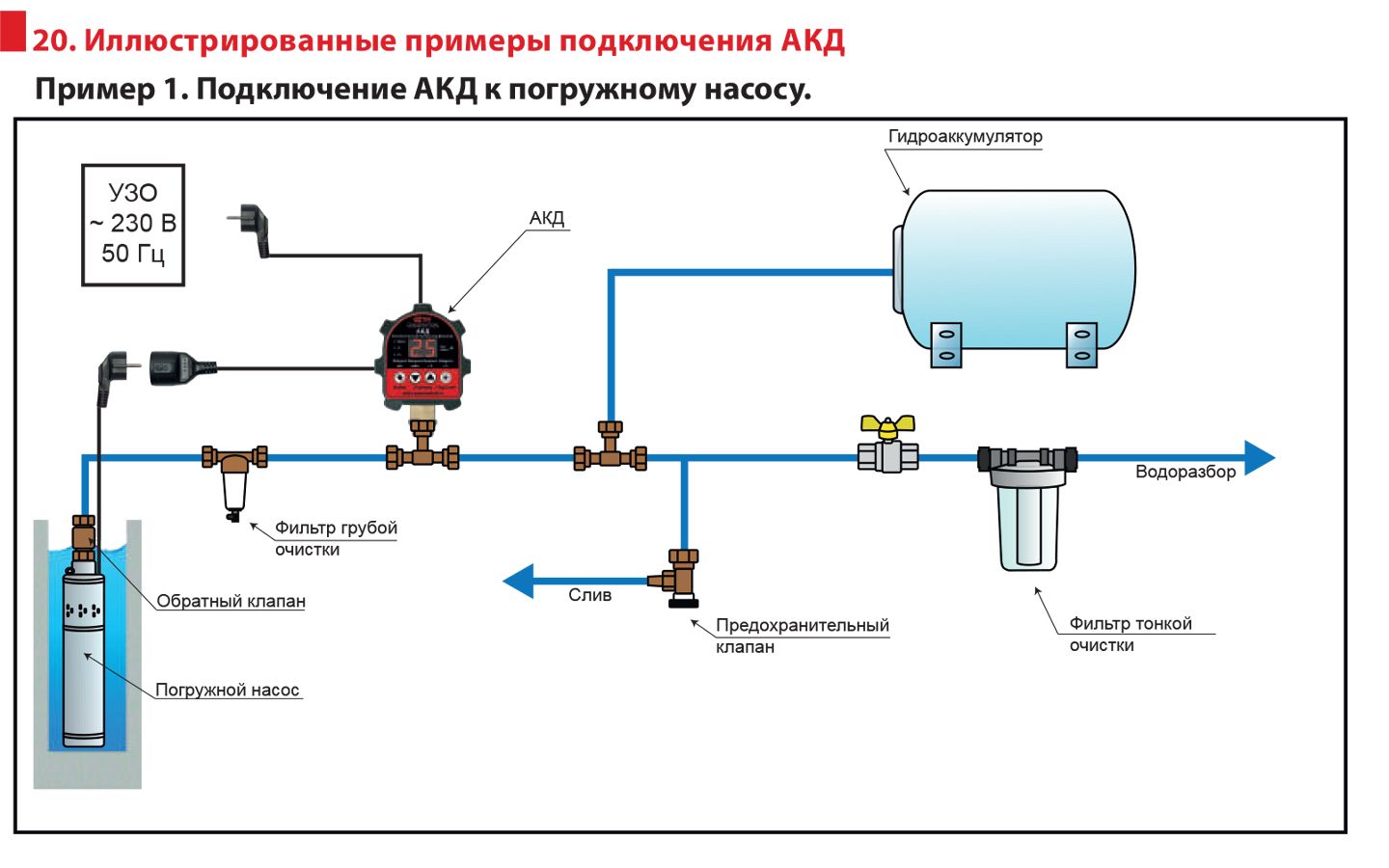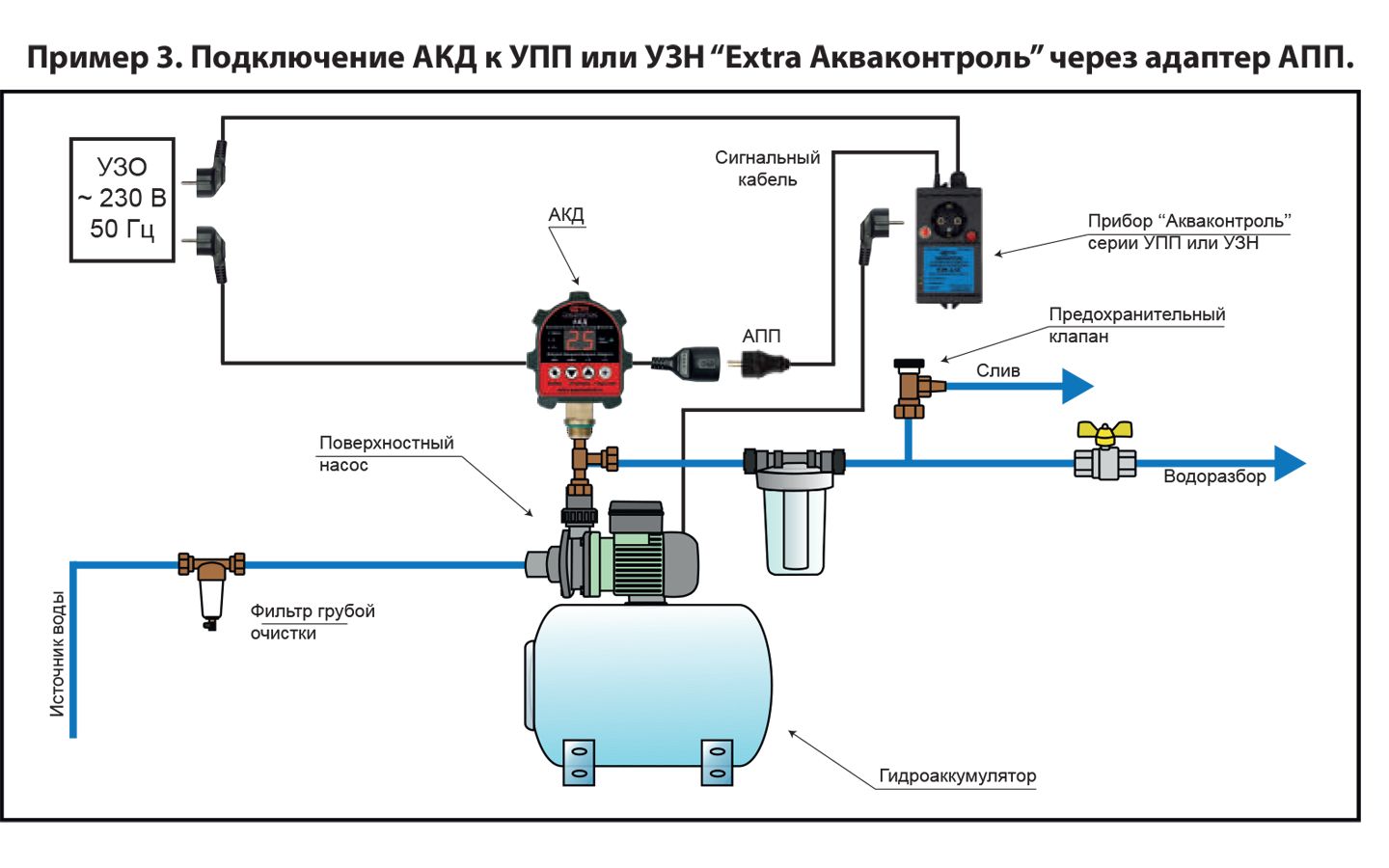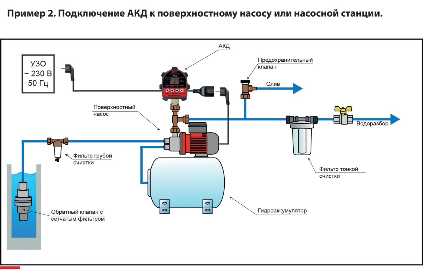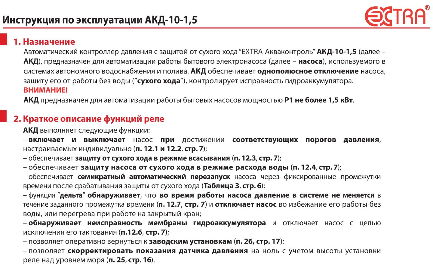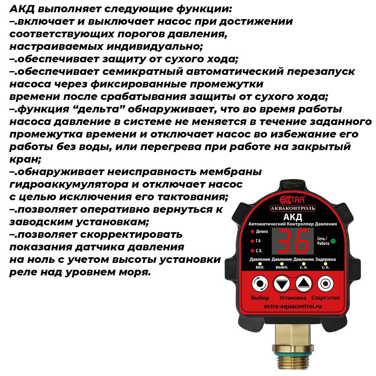 АКД предназначено для установки на трубы в системах водоснабжения для обеспечения стабильной работы насоса и защиты от перегрузок или короткого замыкания. Реле имеет компактные размеры, легко монтируется и не требует специальных знаний для установки и обслуживания.