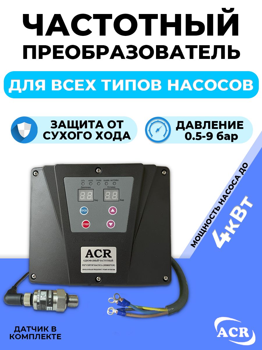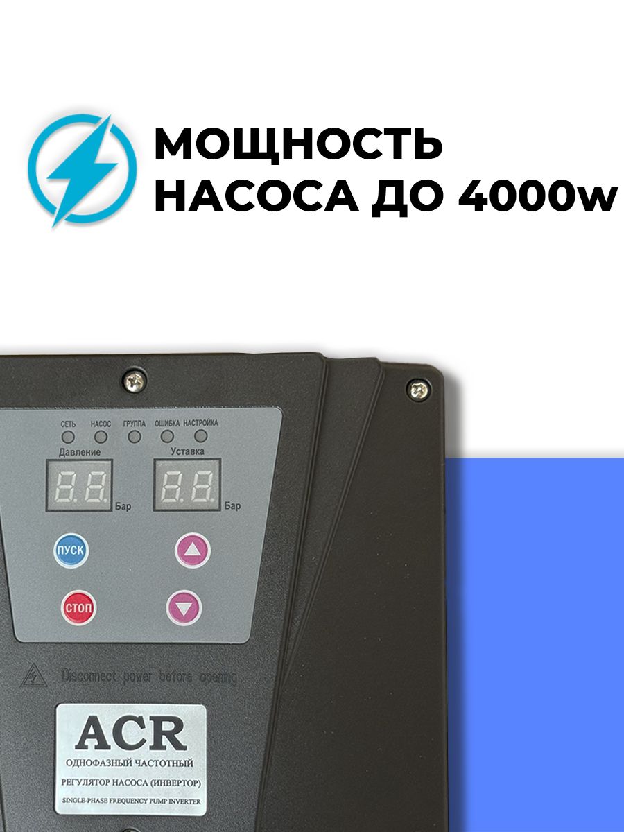 Регулятор с помощью выносного электронного датчика давления отслеживает изменение давления воды в трубопроводе и регулирует обороты насоса путем изменения частоты питающего напряжения насоса, тем самым достигается точное поддержание заданного давления. Регулятор позволяет оптимизировать работу насоса, отпадает необходимость в использовании электро-механическими реле давления и реле защиты от сухого хода, а также сократить потребление электроэнергии. Предназначен для работы с бытовыми центробежными или вихревыми насосами для точного поддержания заданного давления воды в автономных системах водоснабжения