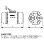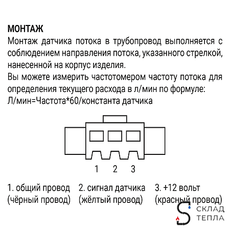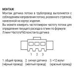 Монтаж датчика потока в трубопровод выполняется с соблюдением направления потока, указанного стрелкой, нанесенной на корпус изделия. Подключение: красный провод +