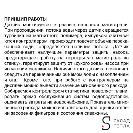 Импульсный датчик монтируется в разрыв напорной магистрали. При прохождении потока воды через датчик вращается турбинка из магнитного полимера, импульсы считываются контроллером, происходит подсчет объема перекачанной воды, определяется наличие потока. Датчик обеспечивает наилучшие параметры защиты насоса, предотвращает работу на перекрытую магистраль «в стенку», гарантирует защиту от «сухого хода» насоса при иссякании скважины. Наличие этого датчика позволяет следить за перекачанным объёмом воды с накоплением итога. Кроме того, при работе с контроллером на дисплей можно вывести значение мгновенного расхода. Собираемая контроллером статистика позволяет планировать время обслуживания систем водоподготовки, оценивать затраты на водоснабжение. Показатель мгновенного расхода можно использовать для оценки степени засорения фильтров и состояния скважины.