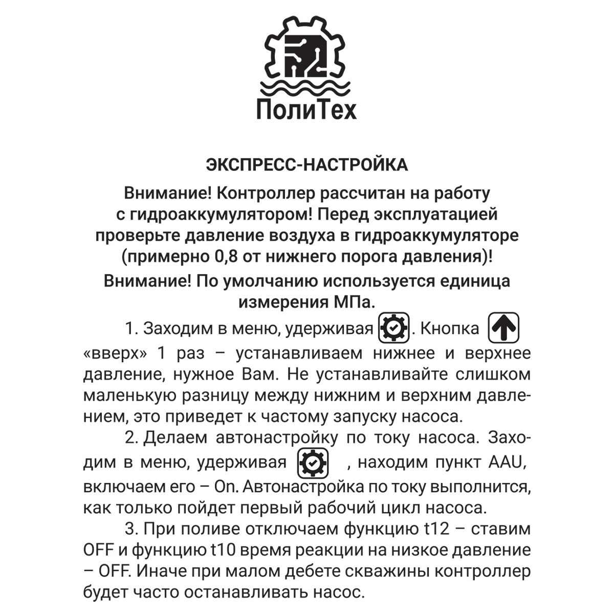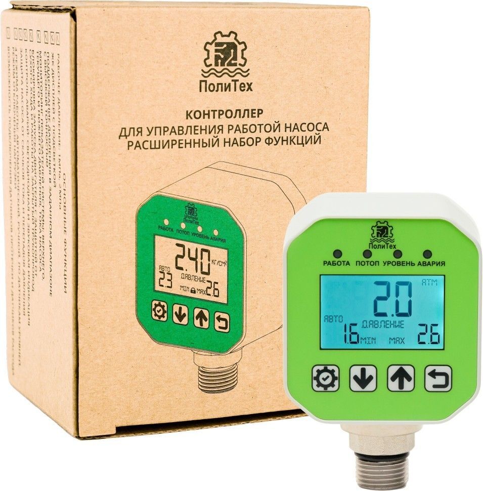 Микропроцессорный контроллер для управления работой насоса «ПолиТех» серии КД-М с плавным пуском в базовой комплектации соединяет в себе функциональные возможности сразу нескольких устройств автоматики для насоса: реле сухого хода для насоса и защиты от работы на перекрытый трубопровод, манометра и других.