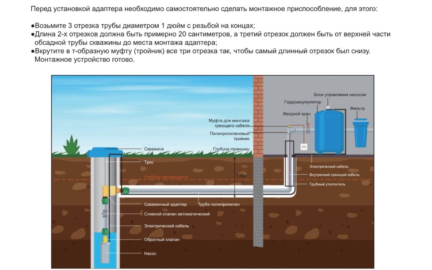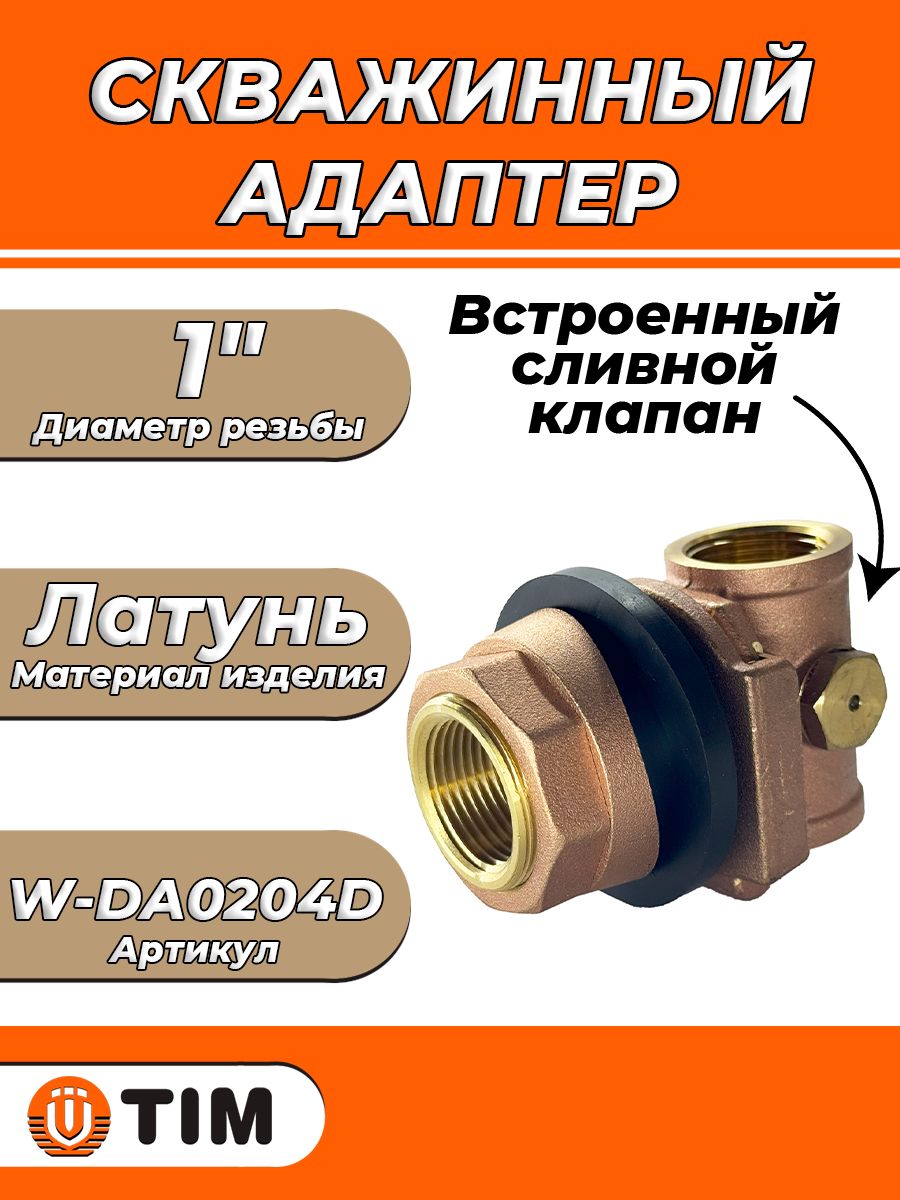 Скважинный адаптер со встроенным сливным клапаном применяется для обвязки скважины и подачи воды из скважины к потребителям, экономит место, время и средства, используется как альтернатива кессону. Встроенный сливной клапан 1/2" в адаптер для скважины позволяет сливать воду на зимний период из системы водоснабжения, сливной клапан срабатывает при снижении давления в системе водоснабжения до 0,6-0,9 атм и сливает воду из трубопровода в скважину.