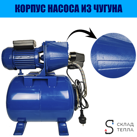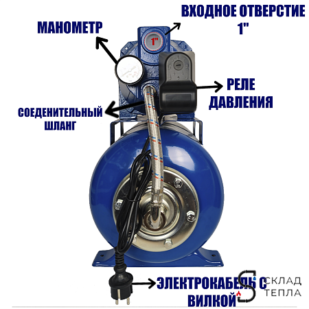 Насосная станция представляет поверхностный насос, соединенный гибкой подводкой с гидроаккумулятором и управляющим насосом реле давления. Поверхностный насос осуществляет забор воды из открытого источника и подачу её под давлением в гидроаккумулятор. После выключения насоса, водоснабжение потребителей осуществляется за счет воды, запасенной под давлением в гидроаккумуляторе.