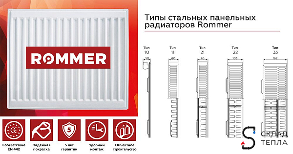 Белые стальные панельные радиаторы Rommer с небольшими рифлеными поверхностями впереди. Применяются в централизованных и индивидуальных системах отопления, работающих под давлением. Данные отопительные приборы имеют преимущество: