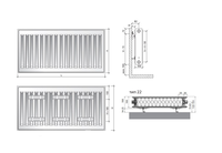 Панельный радиатор Royal Thermo Ventil Compact имеет 6 отверстий для присоединения: 4 из них для бокового подключения и 2 в нижней части допускают соединение снизу. Изделие оснащено накладными элементами, боковыми панелями и декоративной решёткой сверху. В качестве теплоносителя может быть использована вода или незамерзающая жидкость с водородным индексом (рН) от 8 до 9,5 при рабочем давлении до 10 атм.