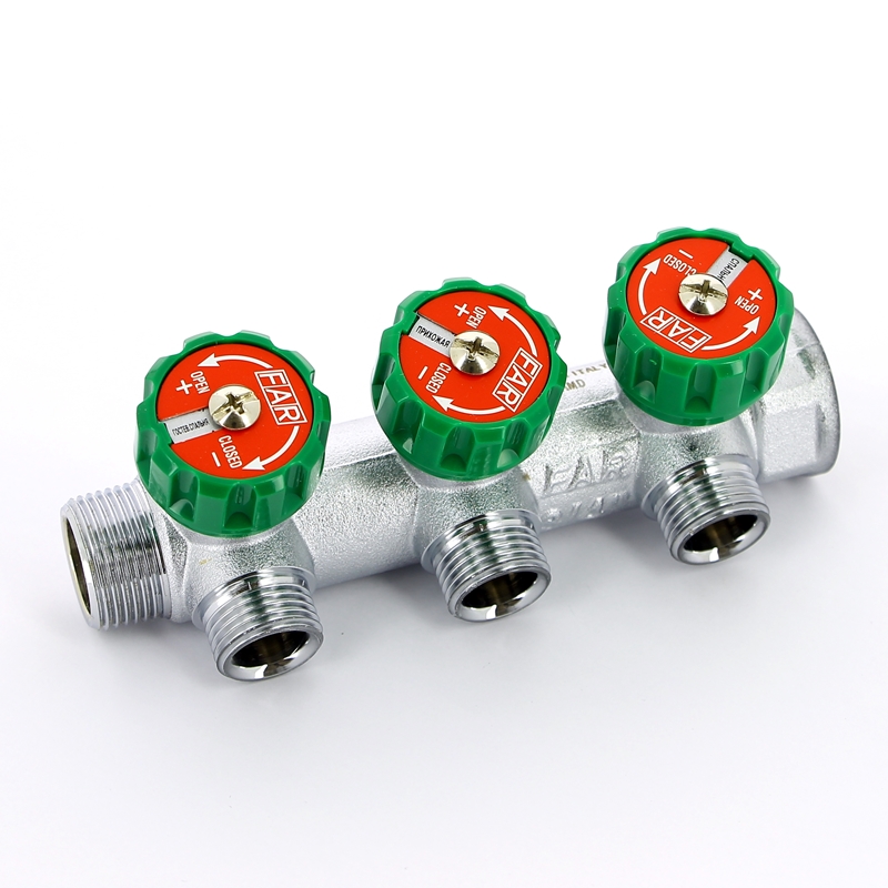 Коллекторы FAR со встроенными регулирующими и запорно-балансировочными вентилями. С помощью расположенной на передней поверхности коллектора управляющей ручки вентиля и закрывающегося колпачка отсекателя, пользователь может легко обслуживать систему без каких-либо дополнительных инструментов.