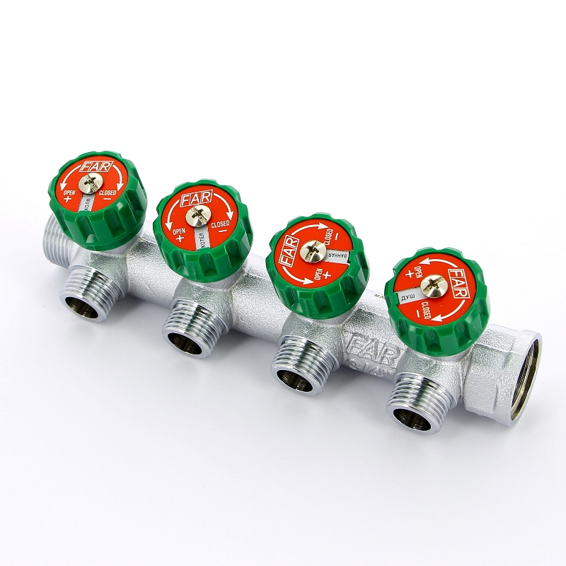 Коллекторы FAR со встроенными регулирующими и запорно-балансировочными вентилями. С помощью расположенной на передней поверхности коллектора управляющей ручки вентиля и закрывающегося колпачка отсекателя, пользователь может легко обслуживать систему без каких-либо дополнительных инструментов.
