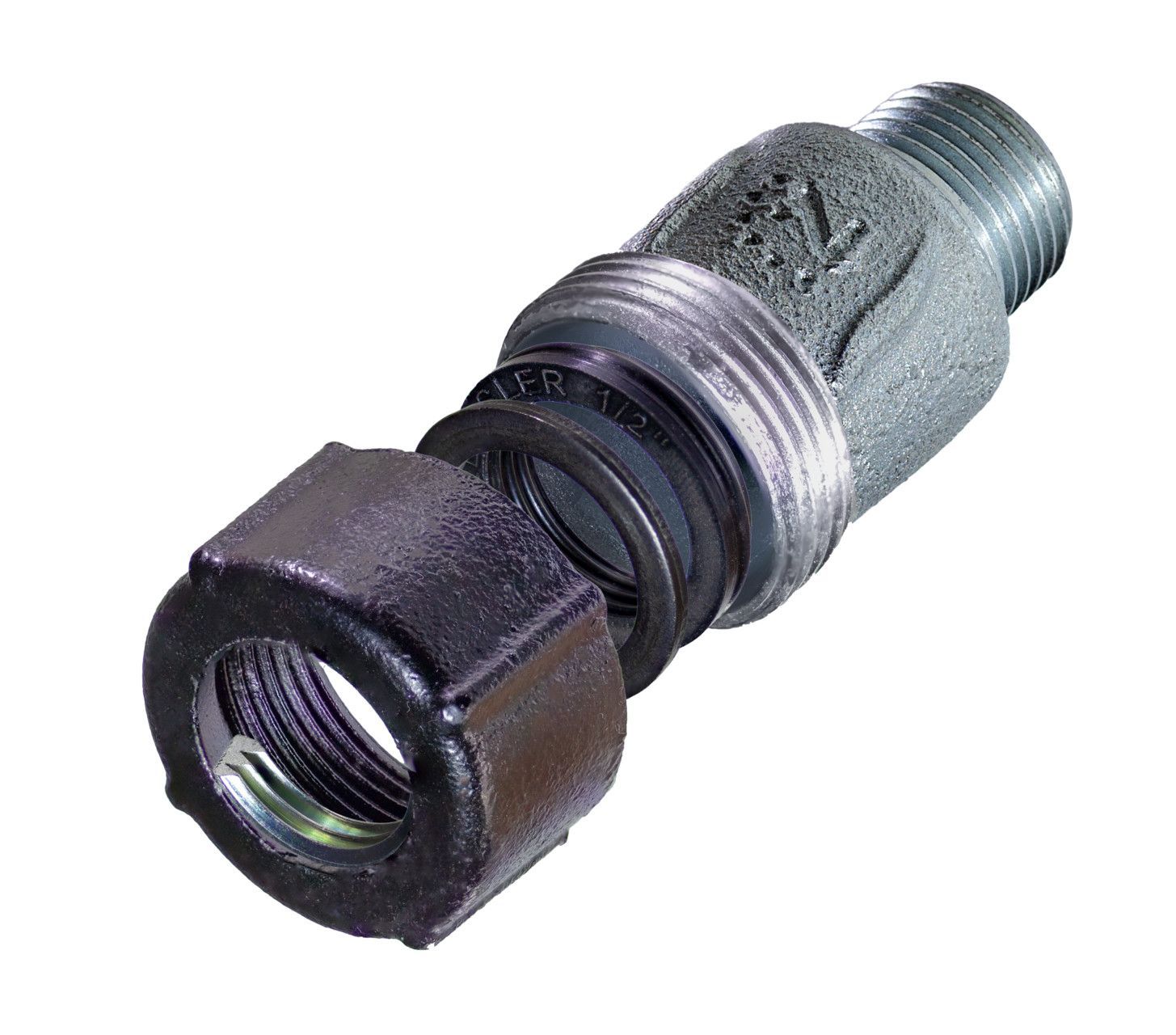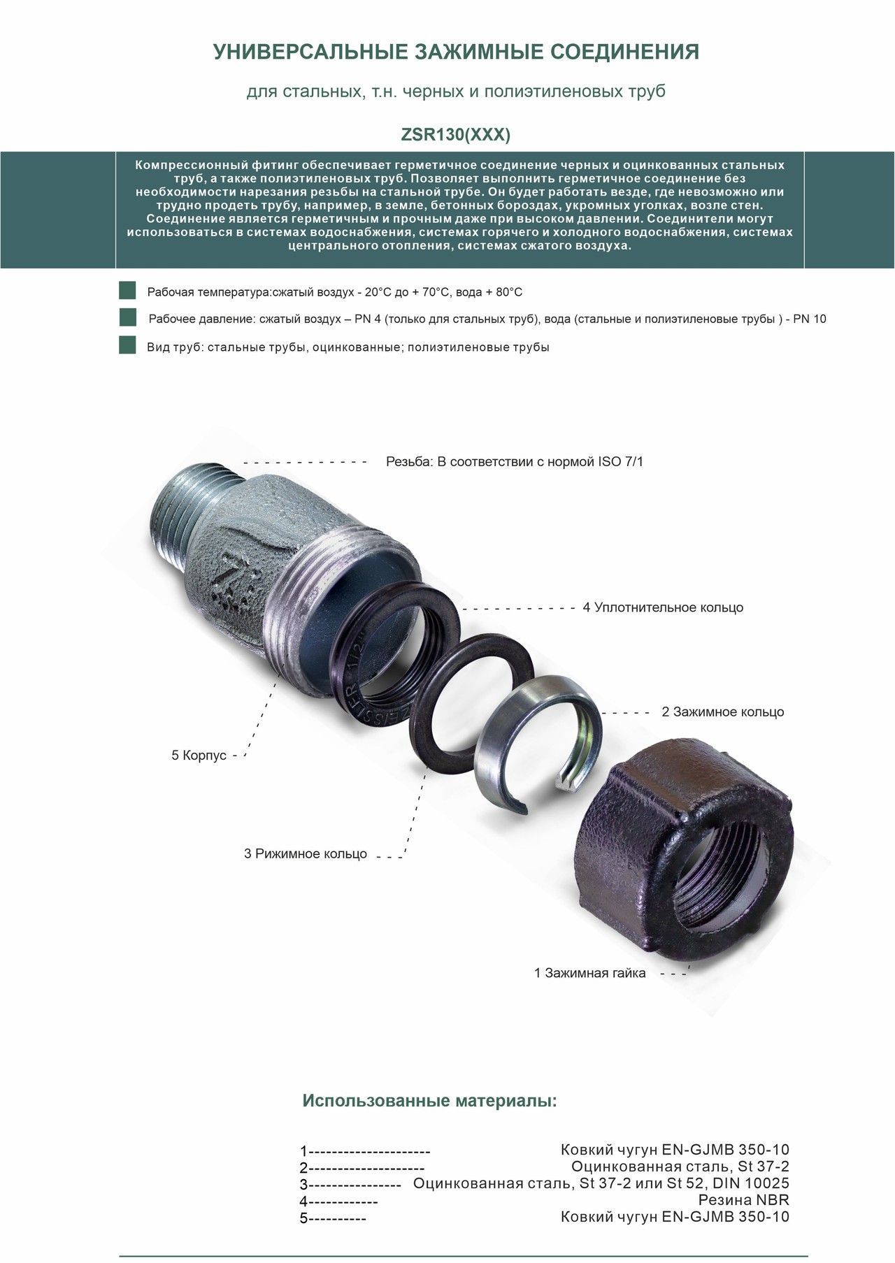 Компрессионный фитинг обеспечивает герметичное соединение черных и оцинкованных стальных труб, а также полиэтиленовых труб. Позволяет выполнить герметичное соединение без необходимости нарезания резьбы на стальной трубе. Он будет работать везде, где невозможно или трудно продеть трубу, например, в земле, бетонных бороздах, укромных уголках, возле стен. Соединение является герметичным даже при высоком давлении. Соединители могут использоваться в системах горячего и холодного водоснабжения, отопления и сжатого воздуха.