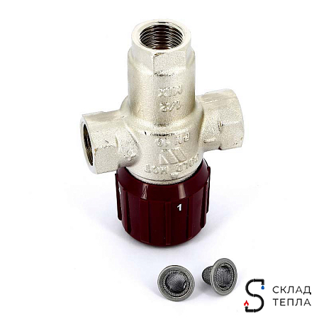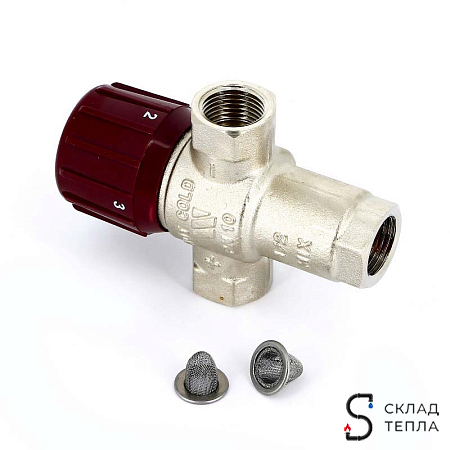 Термостатический подмешивающий клапан, градуированный на 4 положения. Для систем горячего водоснабжения, имеет функцию защиты от ожога. Без встроенных обратных клапанов. Диапазон регулирования температуры горячей воды на выходе от 32 °C до 50 °C. Макс. перепад давления 2 бар.
