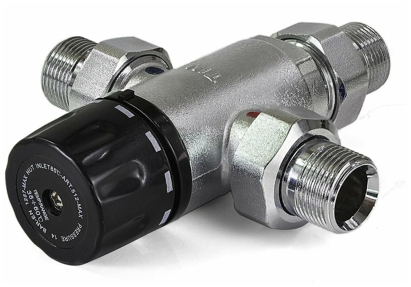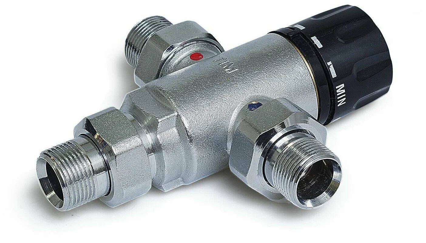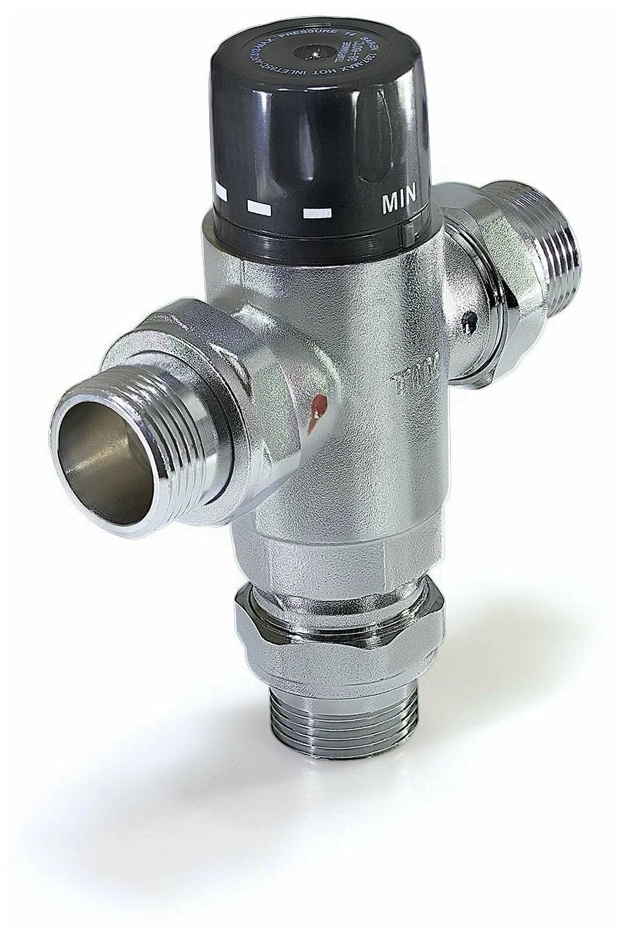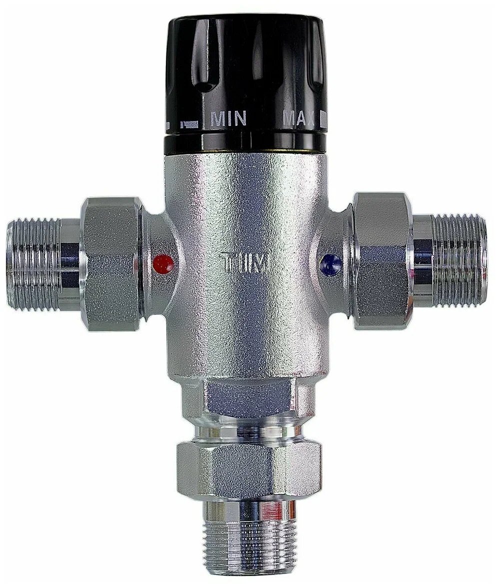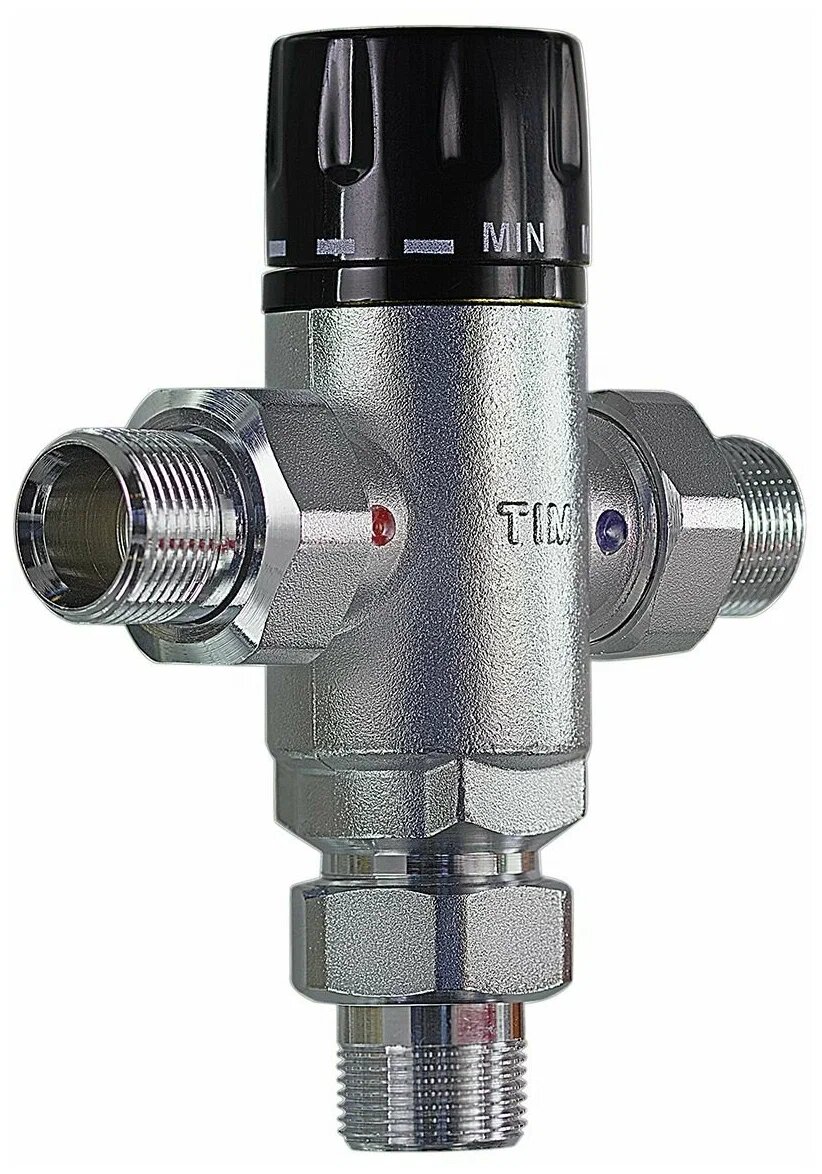 Термостатический смесительный клапан TIM предназачен для регулирования температуры воды. Применяется для централизованного регулирования узлов горячего водоснабжения или локального регулирования водоразборных выходов, для использования в водонагревателях с двойным источником энергии, использующих солнечную энергию. В системах отопления с контурми отопления типа "теплый пол" или для ограничения тепературы обратной воды котла. Материал латунь Покрытие никель Уплотнитель резиновая прокладка Диапазон настройки 38°-60°С