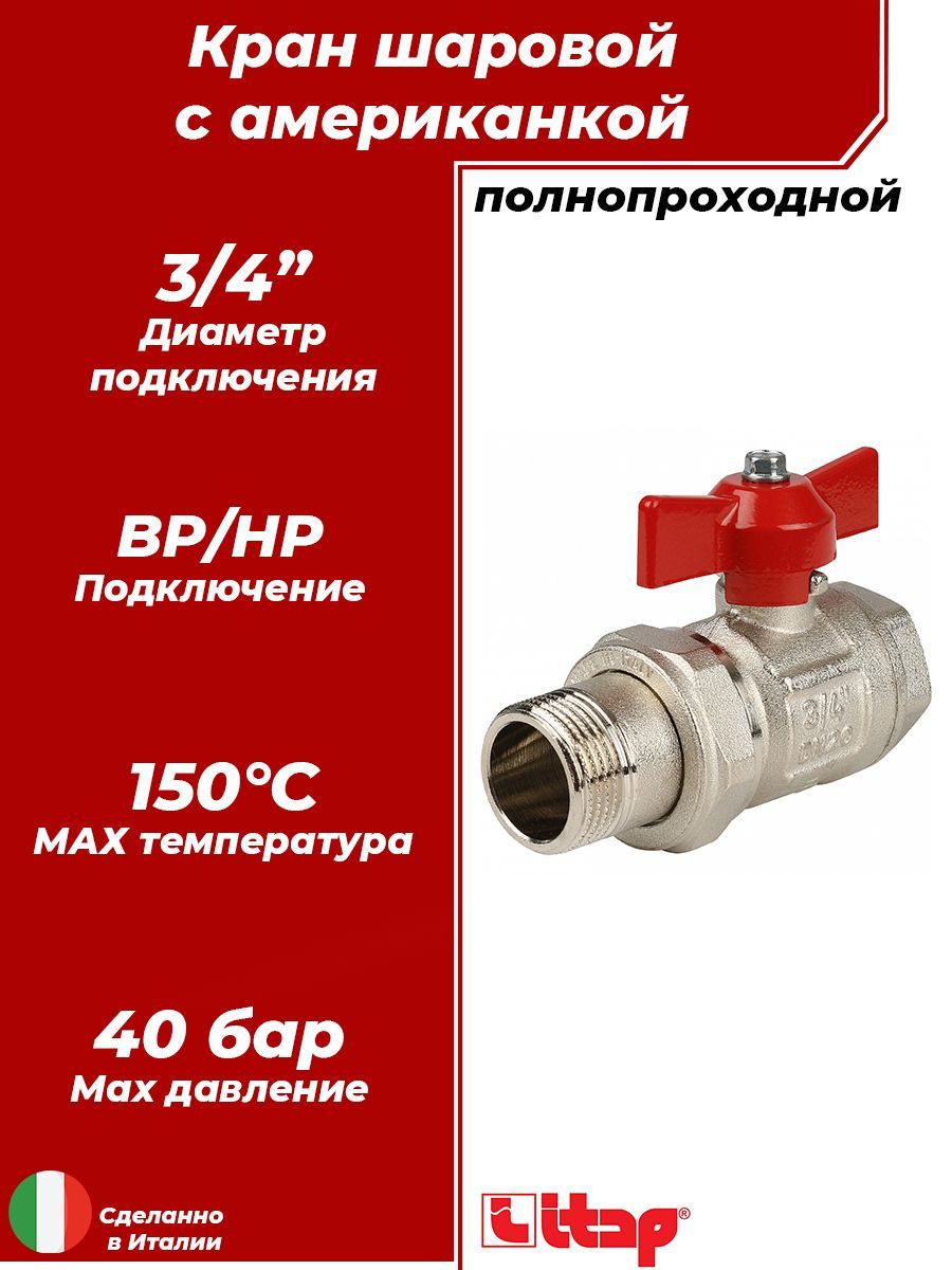 Кран шаровой полнопроходной ITAP IDEAL 098 - 3/4" (ВР/НГ, PN40, Tmax 150°С, ручка-бабочка красная) 26097